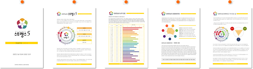 스트렝스5 기업 강점검사는 한국인의 특성을 반영한 긍정심리 기반 강점분류체계로 각 구성원들의 강점을 통해 조직 전체의 긍정적 특성을 살펴보는 기업용 강점검사입니다.